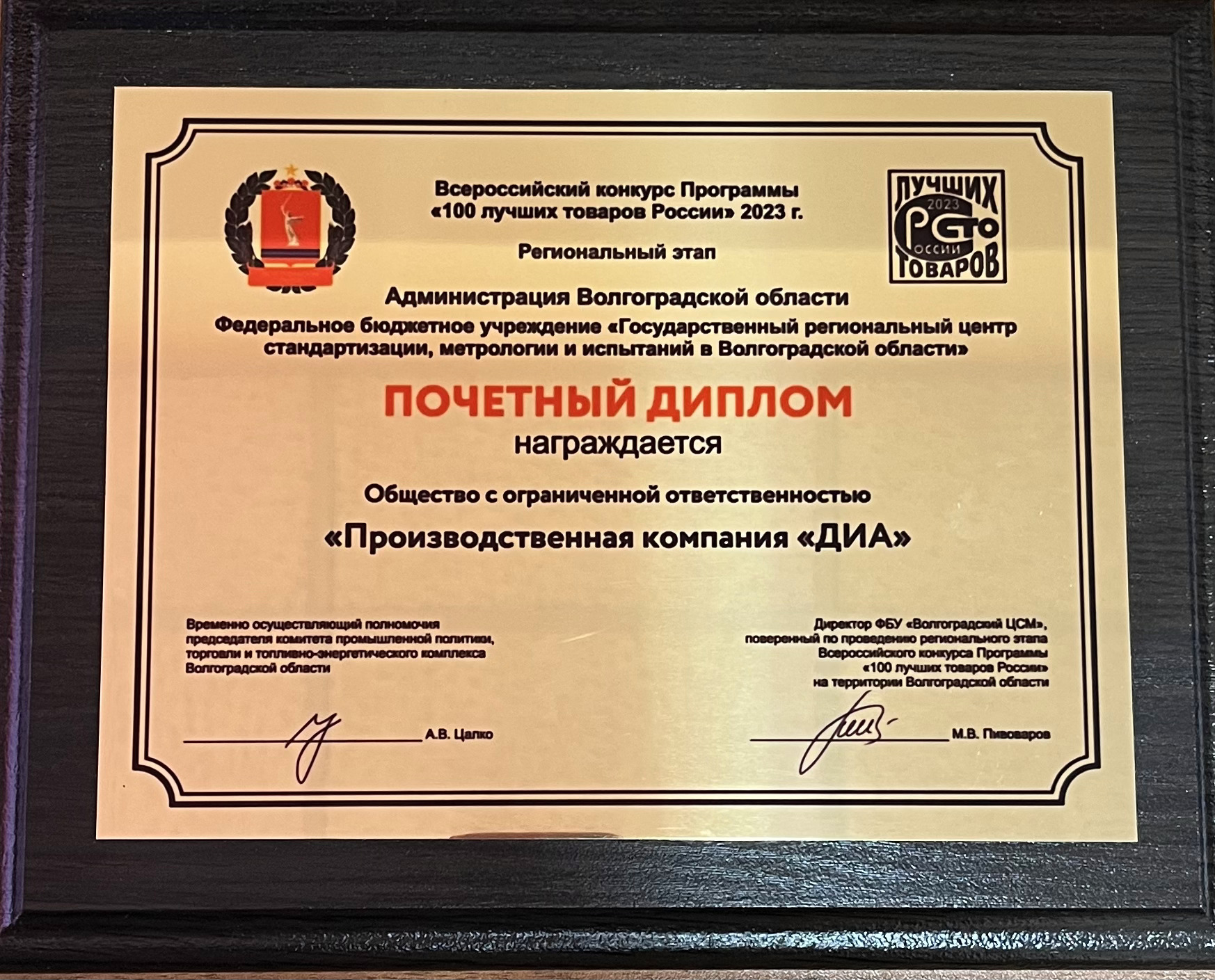 В Волгоградской области определили лучшие товары и услуги. Производственная компания ДИА прошла региональный этап конкурса "100 лучших товаров России" и получила Почетный диплом.